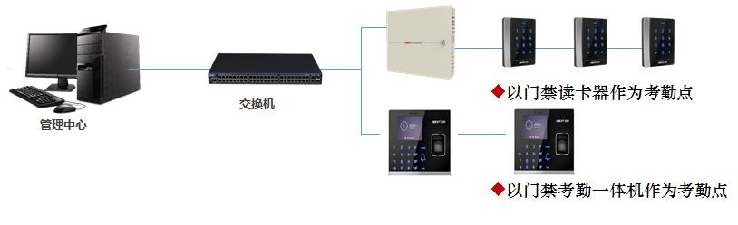考勤管理系統(tǒng)通過綜合管理平臺實現(xiàn)與數(shù)據(jù)庫的數(shù)據(jù)交互,包括人員資料、卡片資料、刷卡數(shù)據(jù)等多種資料。硬件的設置、權(quán)限的發(fā)放以及人員的卡片發(fā)放等由綜合管理平臺統(tǒng)一完成。系統(tǒng)的架構(gòu)如下圖所示:
